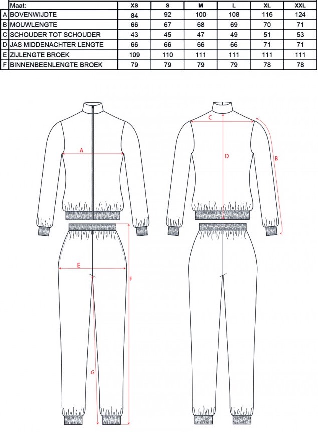 In de mouwen, zoom van het jasje en uiteinde van de broekspijpen zit een elastiek. Jas sluit door middel van een rits aan de voorkant. In de broek zit een elastische band in de boord en heeft 2 steekzakken.