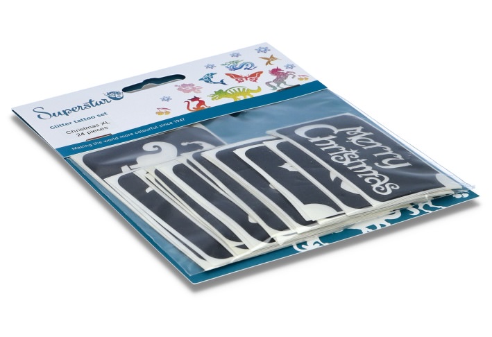 Superstar Glitter tattoo stencils Kerstmis XL 24 stuks (98815). Er is geen kind dat nee zegt tegen een Kerstmis glittertattoo. Wist je dat het eigenlijk heel makkelijk is om ze zelf te zetten? Zelfs een kind kan de was doen, en dat bedoelen we letterlijk. Dus als jij op zoek bent naar een uniek cadeau of een leuke activiteit op een kinderfeestje tijdens Kerstmis, dan krijg je met de complete Kerstmis glitter tattoo set van Painting Faces heel veel blije kindergezichten. Deze set bevat sjablonen die bij zowel jongens als meisjes in de smaak zullen vallen.
